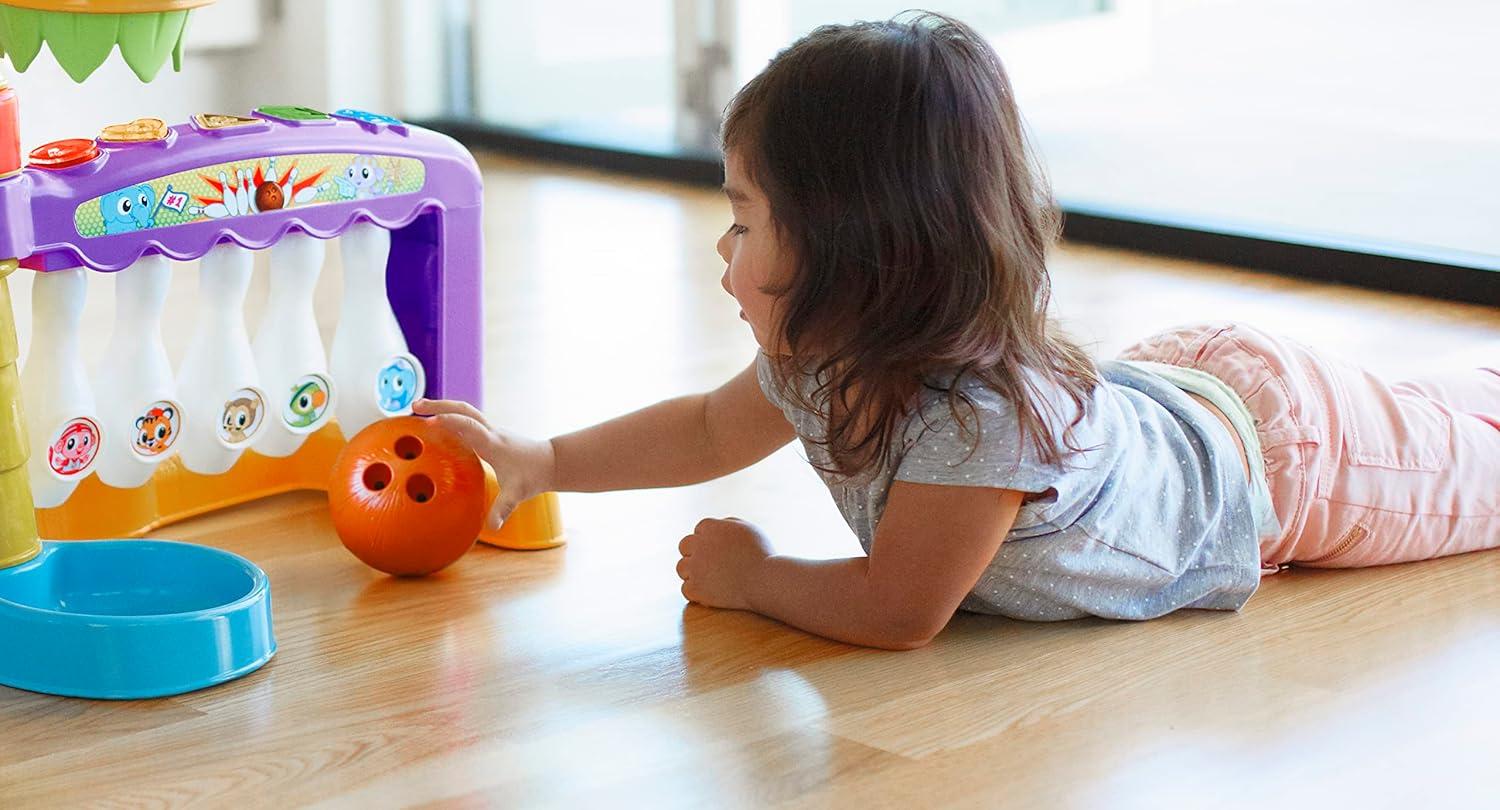 75+ SONGS, SOUNDS, AND PHRASES – Make a goal or basket to hear sounds and phrases. The backboard lights up when shots are made. Bowling pins play music, phrases and animal sounds when knocked down.
