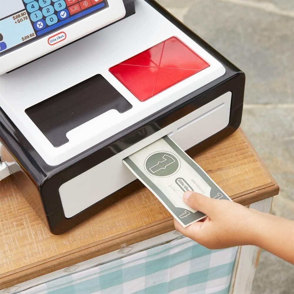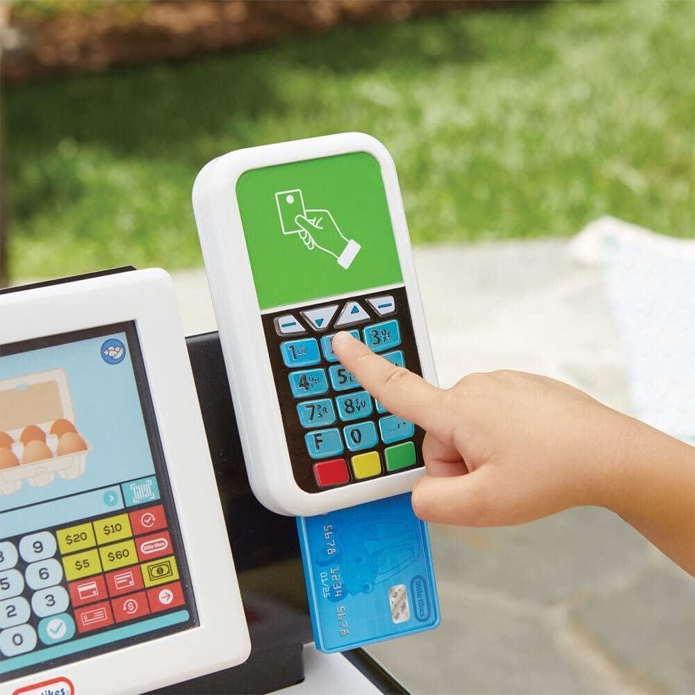 The super realistic Little Tikes® First Self-Checkout Stand has everything kids need so they can pretend to go shopping and pay for their purchases. This role play self-checkout stand has a sleek, modern look and is packed with interactive features: a flatbed scanner, handheld scanner, payment keypad, and a coin dispenser. Plus, it makes realistic beeping sounds and lights up for hours of imaginative play. Kids can pretend to shop in a grocery, hardware, or clothing store by choosing between the three included monitor screens. Pretending to go to the store helps kids gain a sense of responsibility, an important part of social-emotional learning. The First Self-Checkout Stand is easy to set up and includes more than 40 realistic shopping accessories. Encourage kids to engage in imaginative pretend play with the First Self-Checkout Stand by Little Tikes®!
