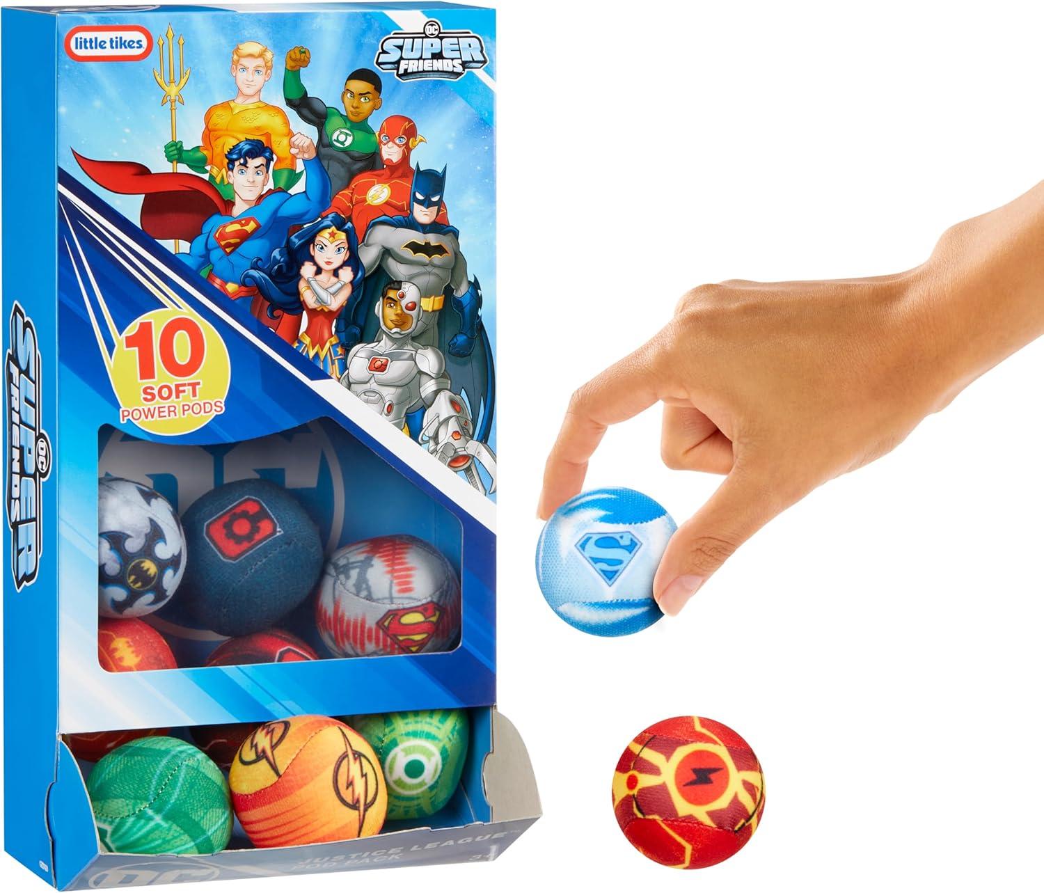 Your little superhero can pretend to fight alongside the Justice League with these epic DC Power Pods! Compatible with all Little Tikes™ DC Boom Blasters, this expansion set will keep the adventure going for hours during playtime. With designs inspired by characters like Superman and The Flash, these extra ten Power Pods bring the DC fun to encourage imaginative play. These pods are great for both indoor and outdoor use, and their soft design ensures a fun yet safe time for everyone. When the battle is over, the product packaging easily stores all ten pods for quick cleaning.