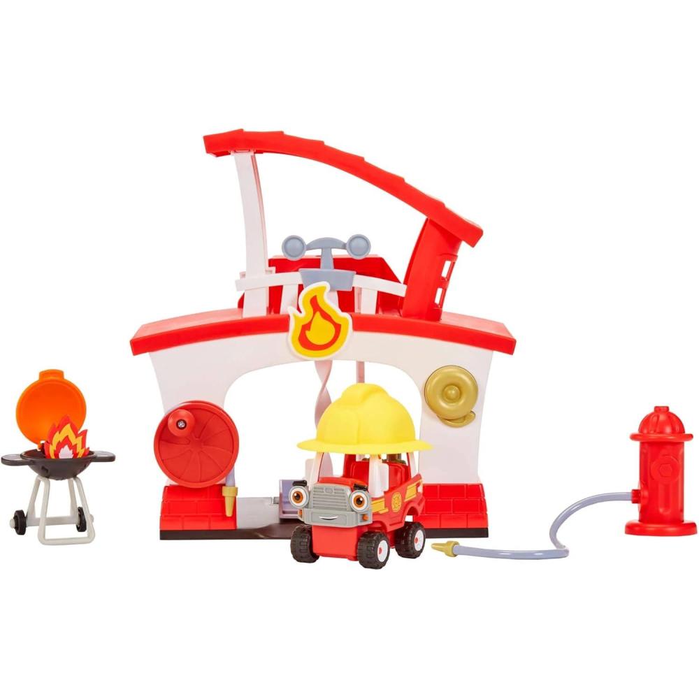 INCLUDES: Fire Station Playset, Cozy Fire Truck, Rescue Hat, Barbecue Grill with pop up flames, and working Fire Hydrant