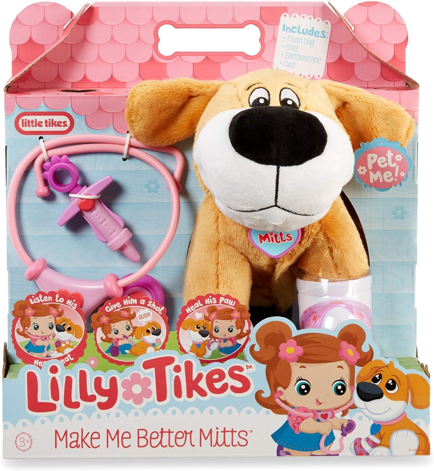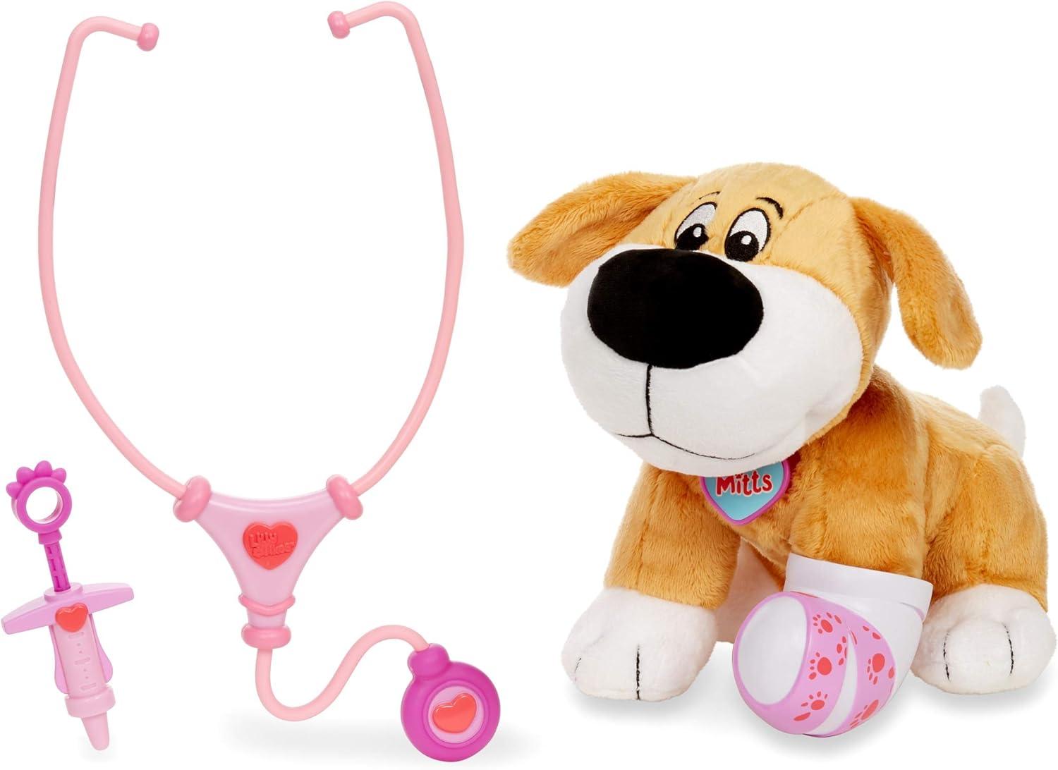 Mitts is a clumsy dog who's always getting into trouble. Lilly and her best friend Ami are always there to make him feel better. Mitts has tons of built-in interactivity: he whimpers when kids give him a booster shot, barks happily when kids pet him, makes realistic heartbeat sounds when kids listen to his heart with the included stethoscope, and has a paw that glows till kids put his cast on. Mitts comes with everything kids need to pretend to take care of him: a booster shot, stethoscope, and cast plus a collar and name tag. Best of all, Mitts' soft, plush body makes him so huggable and snuggly. No matter where their imagination takes them (with their scrappy puppy Mitts), Ami and Lilly know that together is the best place to be.