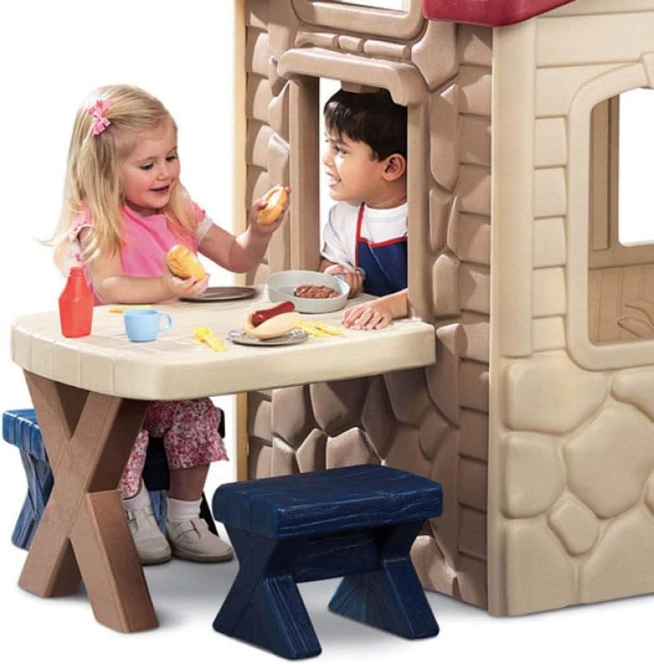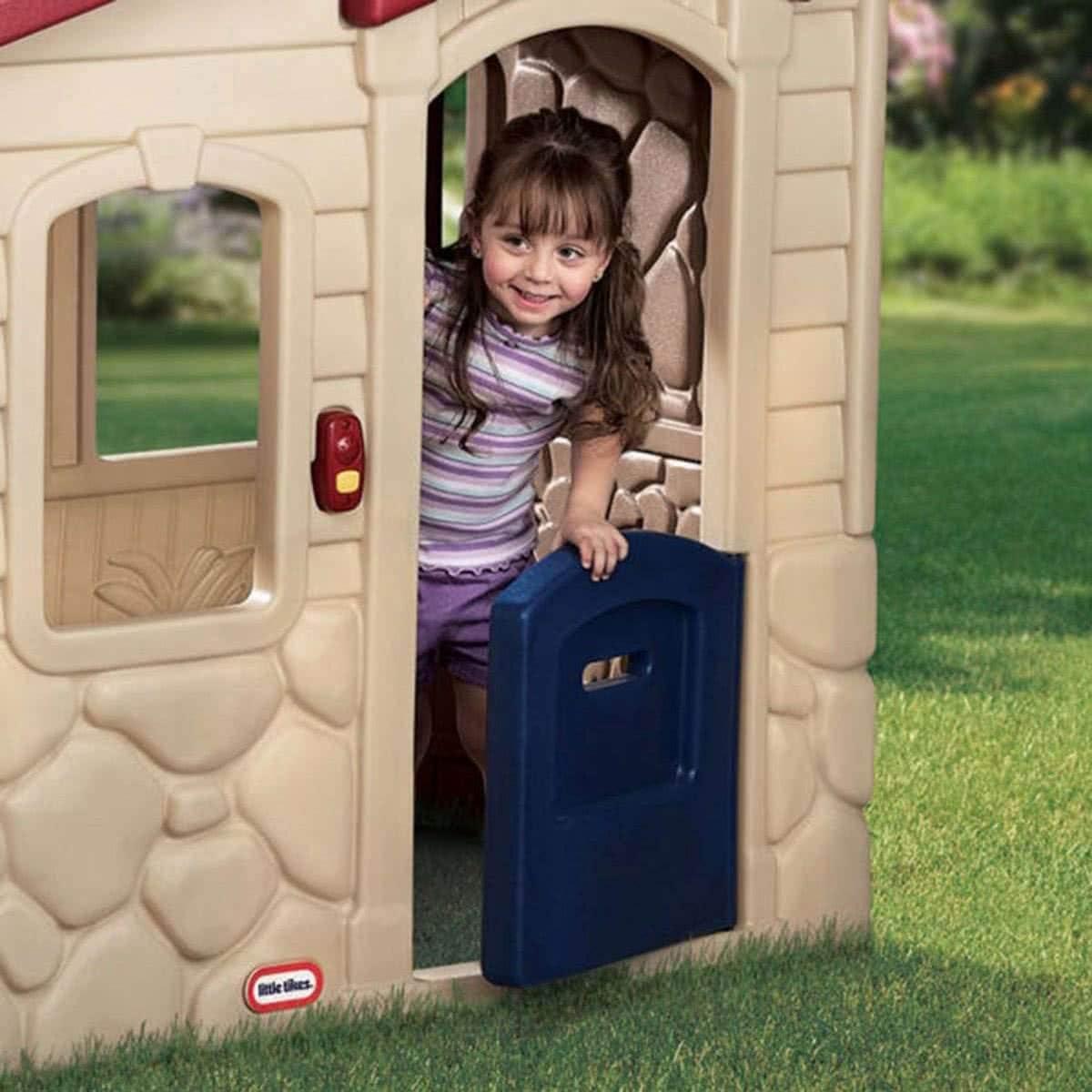 Pull up a chair and sit right down, the picnic's about to begin! Creative chefs use the window in the playhouse to pass meals from the kitchen to guests at the patio table. Playhouse has a kitchenette with pretend burners, oven, cupboards, and fireplace, as well as a working door, mail slot, and picture windows. Includes play food, tableware, and pretend phone. Electronic doorbell makes 6 fun sounds.
