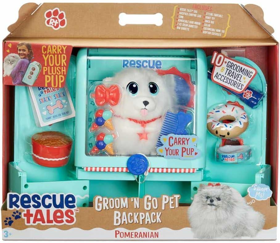 Take fun and style on the go with the Rescue Tales™ Groom 'n Go Pet Backpack. Kids can carry the included Pomeranian plush around with them in the kid sized backpack. When kids take the backpack off, it converts into a grooming salon with styling turntable. Grooming accessories like a removable hand mirror, comb, stylish collar, bow barrette and 2 ice cream barrettes are included. And kids will have everything they need to take their plush pet on a trip, as the backpack also includes a blanket, toy, treats and food bowl. Your Pomeranian plush pet will be super happy and feel so well taken care of.