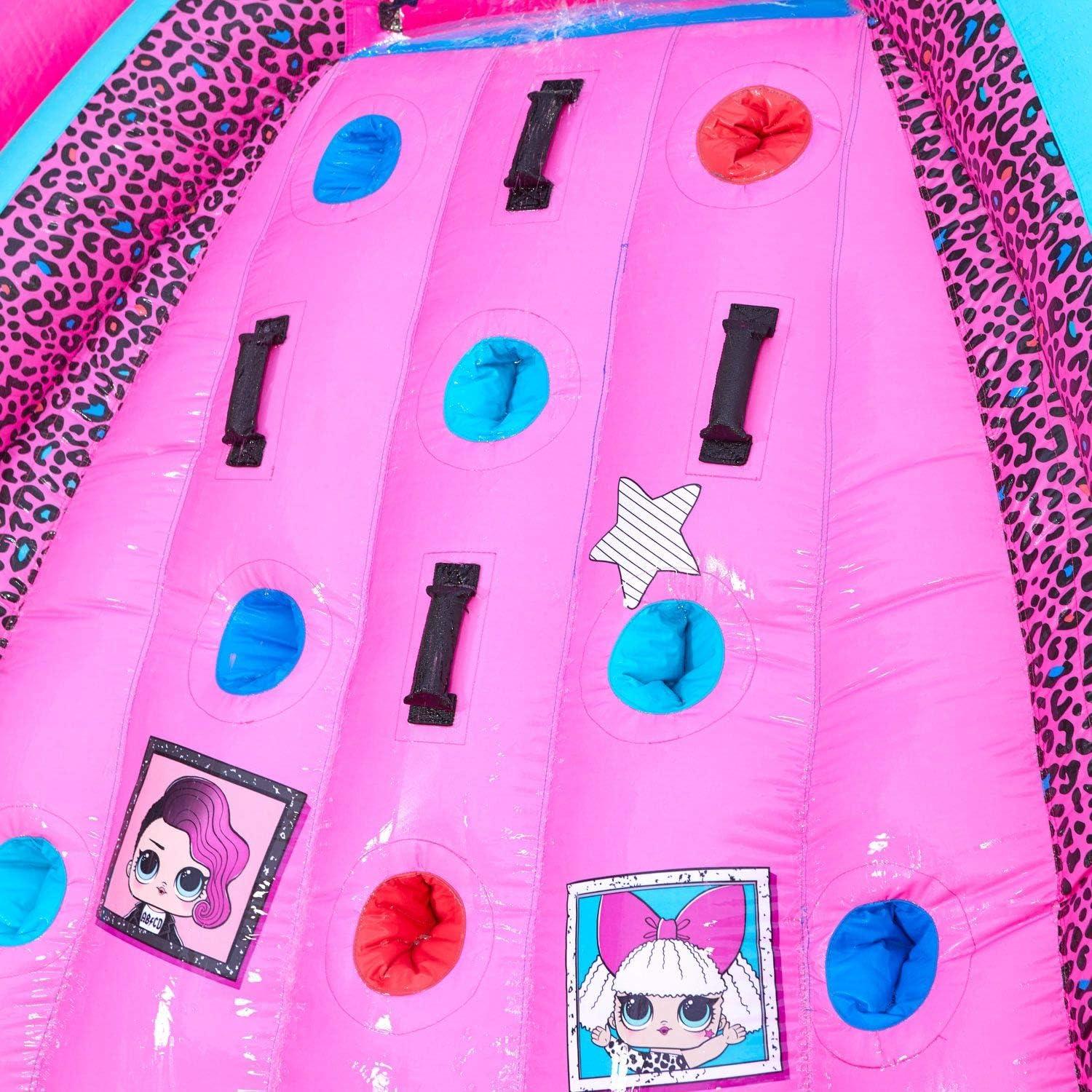 • A surprise dump bucket pours water on kids climbing up the center inflatable rock wall