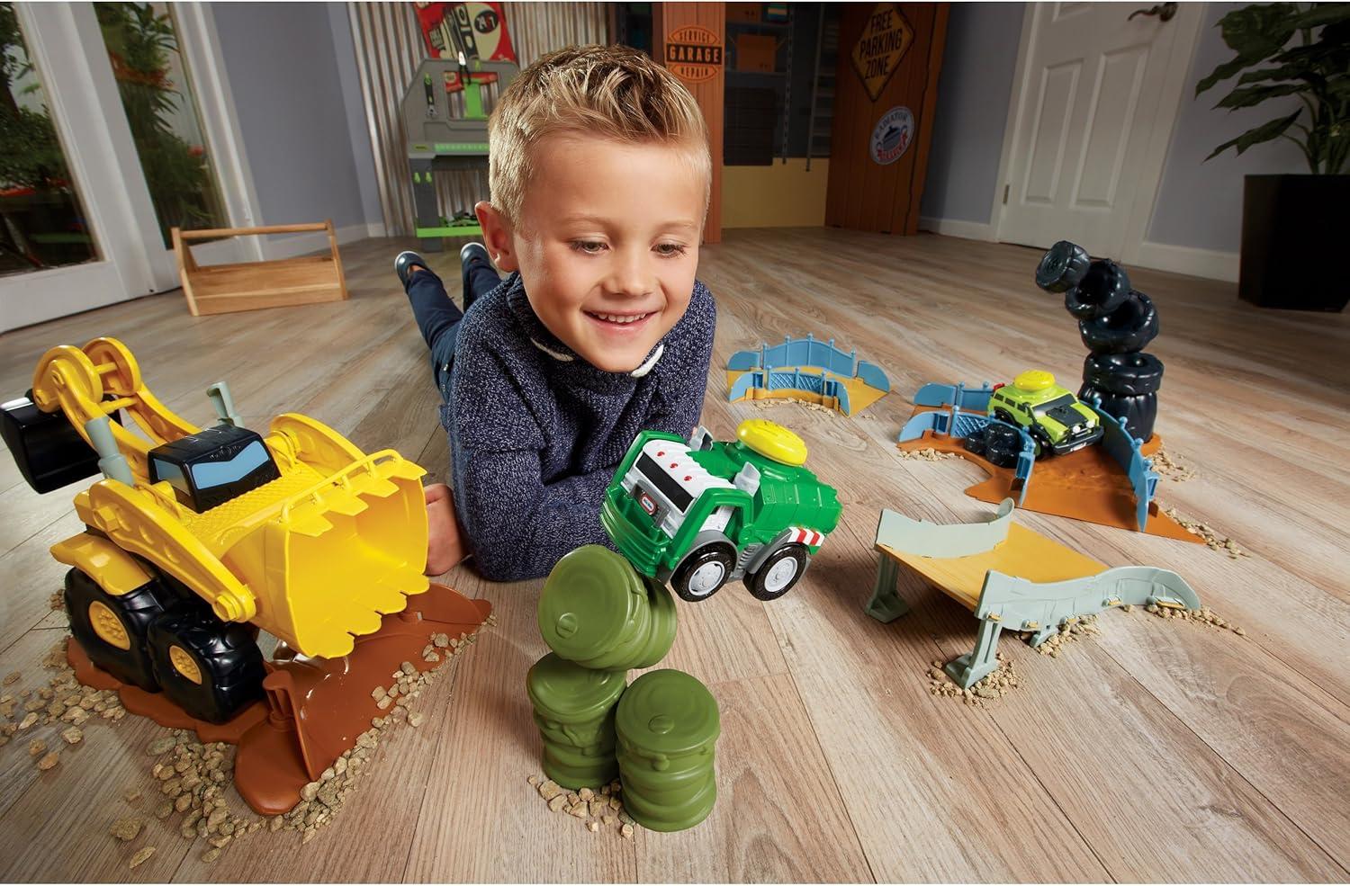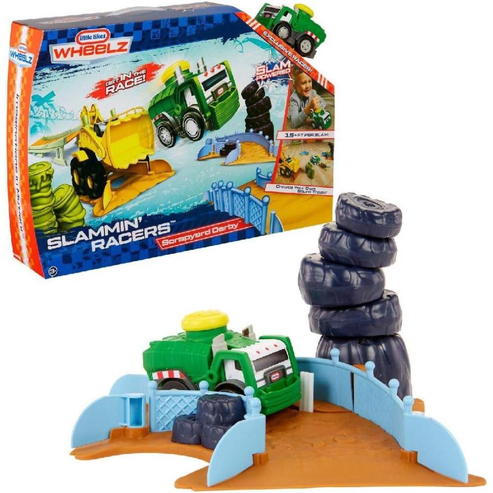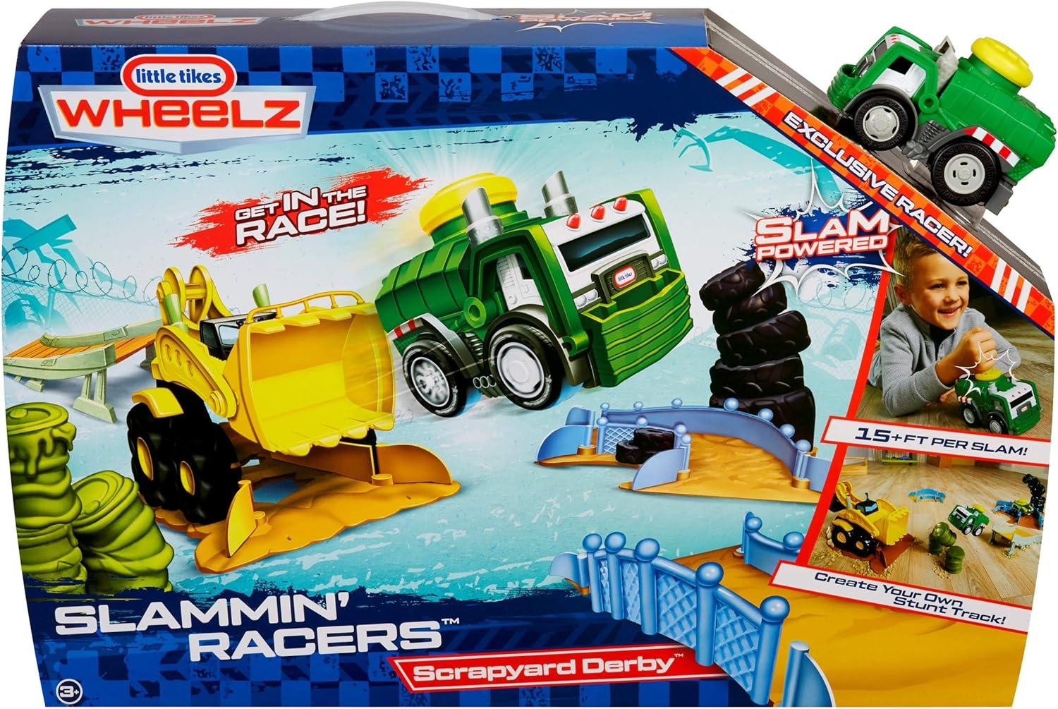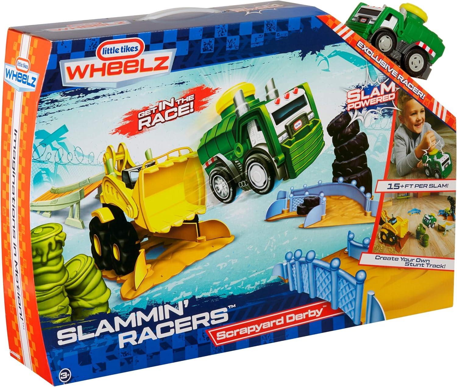 Get in the race with slamming' Racers! These Slam powered cars go 15+ feet per Slam. The rugged and durable design makes sure your tike is always ready to race. Add customizable twists, turns, and jumps to your race with the slamming' Racers Scrapyard Derby. This playset features turns, a jump, a moving loader, and more. Each Slam sends your race car over 15 feet. Slam, smash, and get in the action with slamming' Racers!