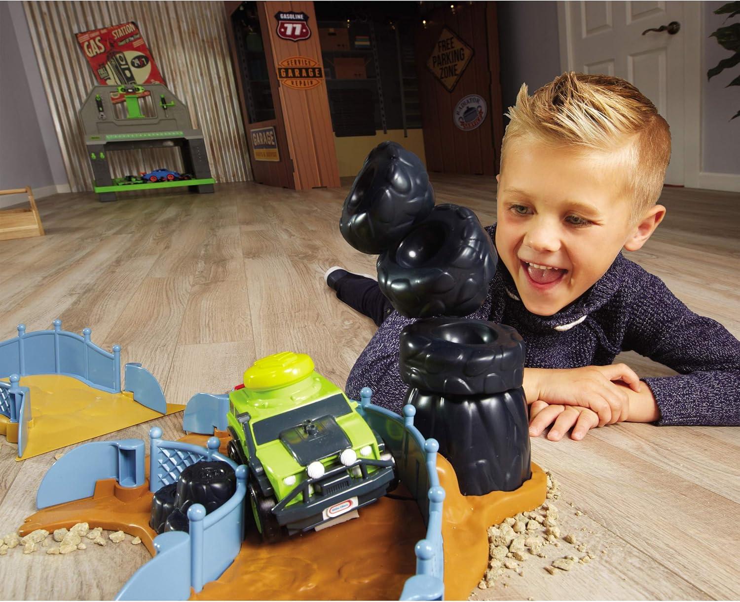 Includes: (4) challenging tracks, (3) jump barrels. Tracks: (1) teeter totter truck tunnel, (2) tumbling tire escapes, (3) bank turn, and (4) steep jump.