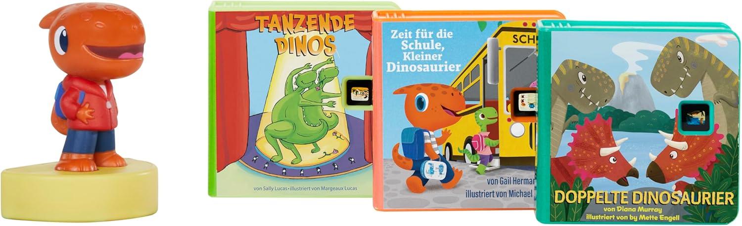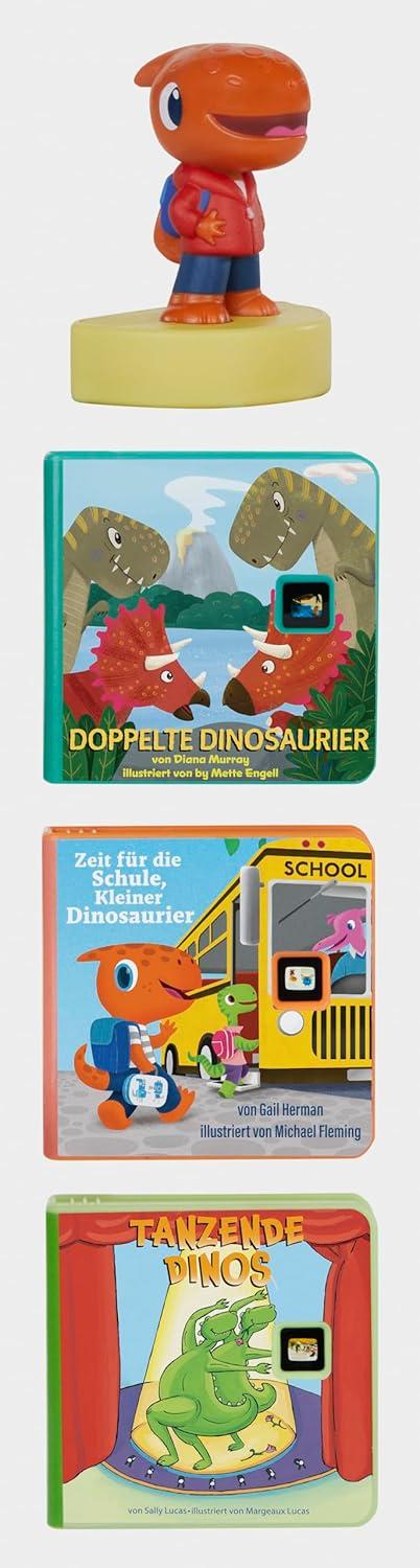 3 STORIES & 1 FIGURINE: this collection contains 3 dino stories and 1 small dinosaur figure that creates light effects in night light mode