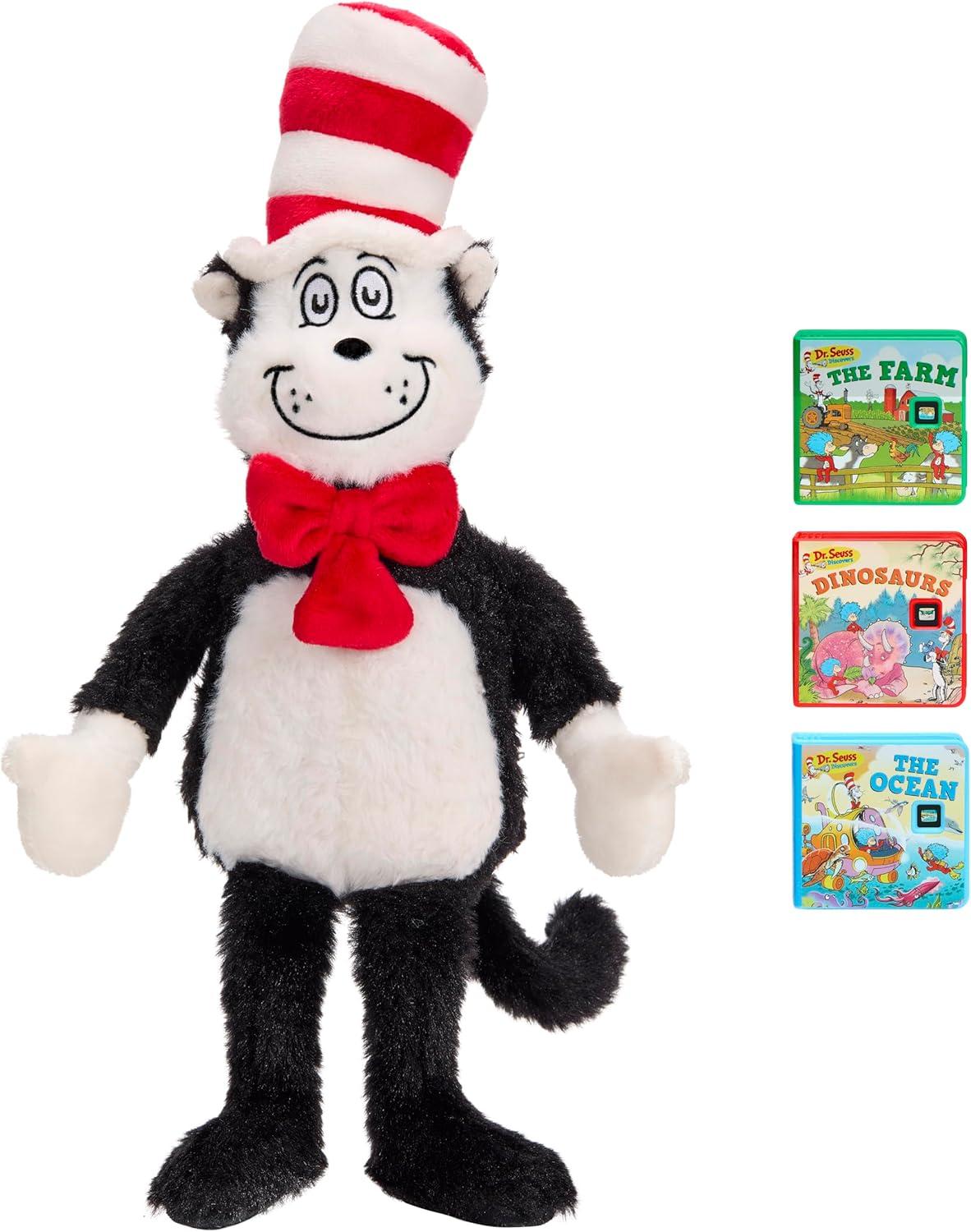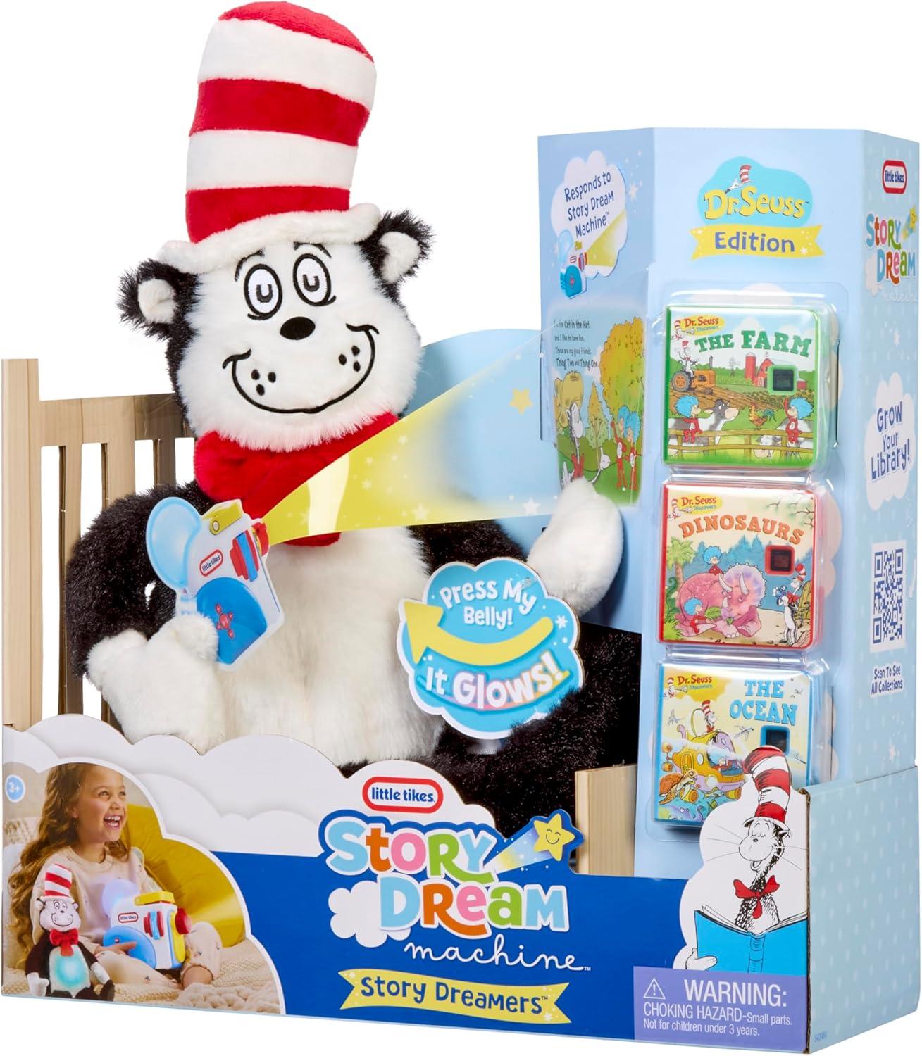 Join Cat in the Hat for a journey into the whimsical world of Dr. Seuss with Story Dreamers plushes. Pair with the Story Dream Machine projector (sold separately) and watch as the Cat in the Hat™ plush talks and glows in response to each Dr. Seuss tale. With this cuddly plush and exclusive story pack, children can enjoy a unique storytime experience filled with the wonder of Dr. Seuss. When storytime is over, the Story Dreamers plush offers even more ways to play with three different settings. Choose between SPEAK MODE, MUSIC MODE, and WHITE NOISE MODE to enjoy 5 fun dialogue bites, 7 different songs, and 4 white noise options. Story Dream Machine combines imagination with elementary literacy training. The blend of auditory and visual elements makes for a fun storytelling experience that builds kids’ confidence and excitement about reading. This Story Dreamers set includes a Cat in the Hat light-up plush and three new Dr. Seuss stories. The always-expanding Little Tikes library offers a great variety of classic and new tales to choose from to bring storytime to life. Story Dream Machine projector, additional story cartridges, and character collectibles sold separately.