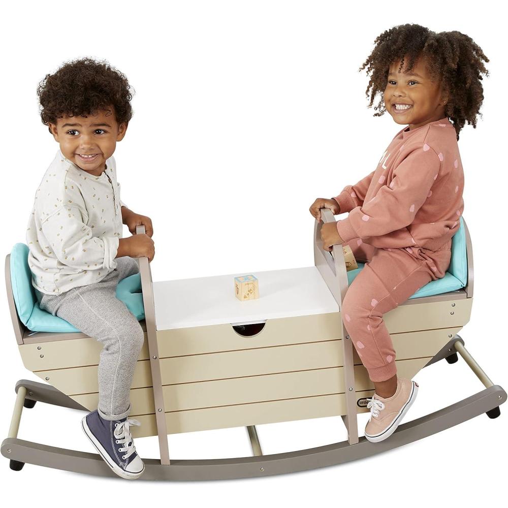 This surprisingly stylish teeter totter is fun to ride and doubles as a secret storage bench. With fabric seat cushions and back support, little ones will teeter and totter to their hearts' content, while the large rocker handle gives them something to hold onto and helps them stay put. Easily accessible top-load storage puts the “fun” in “functional” and helps keep your space clean.? This wooden teeter totter storage bench easily blends in with home décor. Recommended for kids ages 2-5 years?.