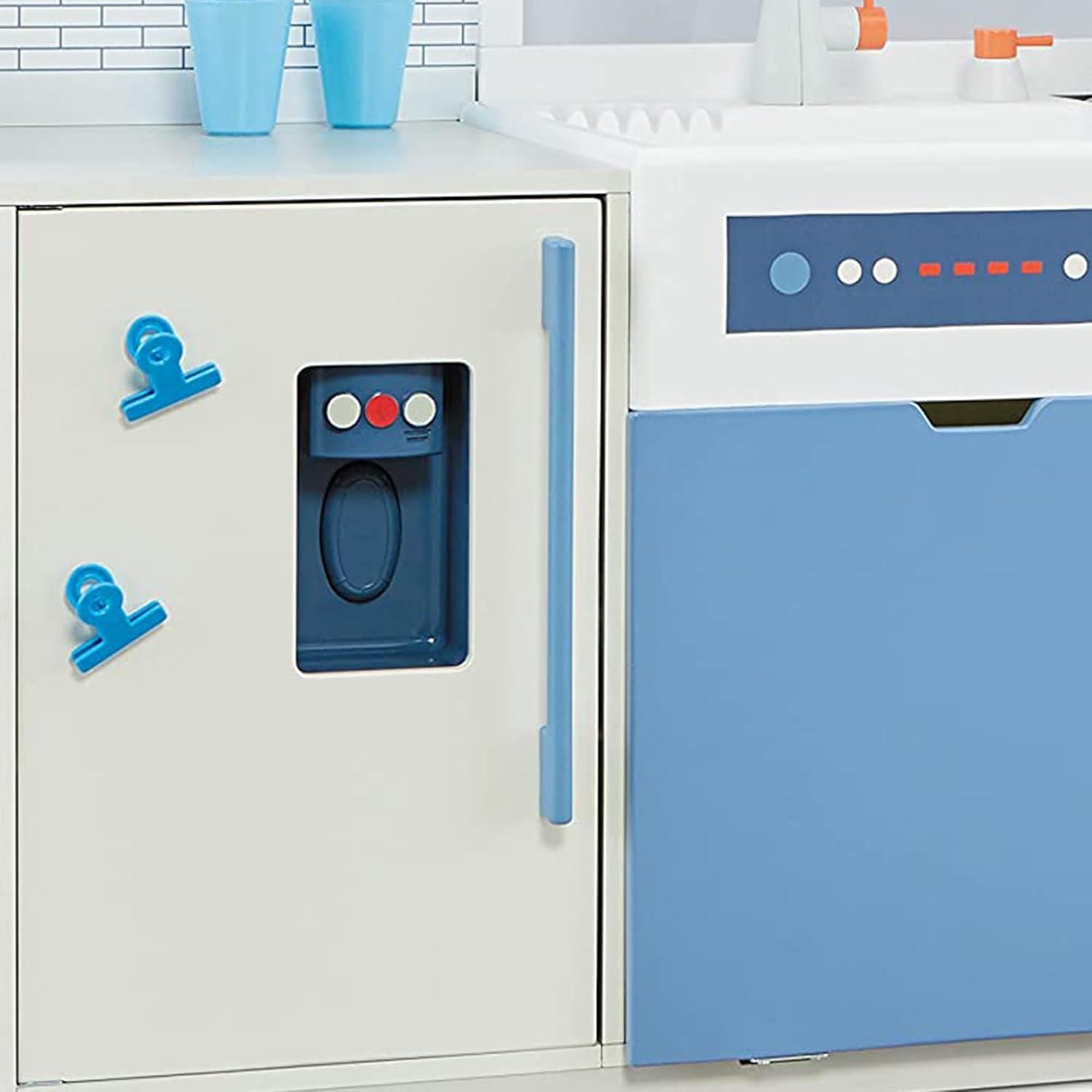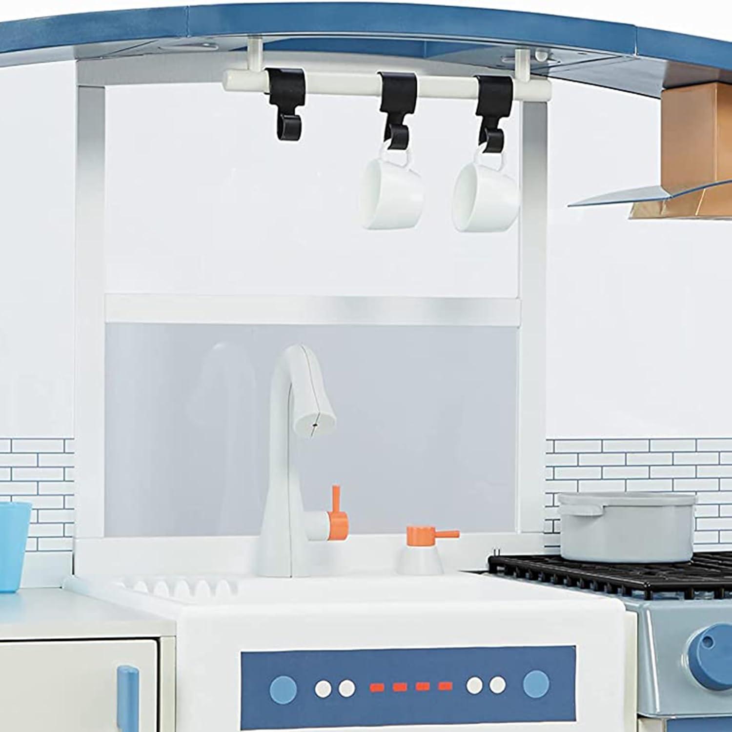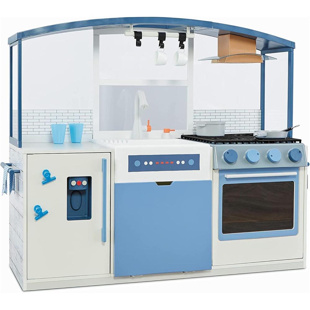SPECIAL FEATURES: The canopy comes with built-in lights, hanging rack and vent hood. And the fridge features an ice dispenser that makes sounds and a front door that can be customized with notes and photos using the included clips. Plus, the oven lights up and has burners that make sounds for enhanced fun.