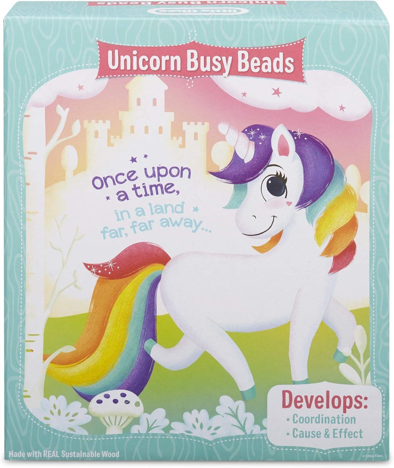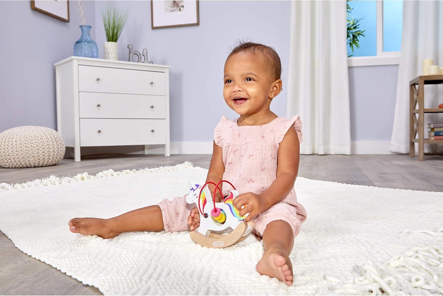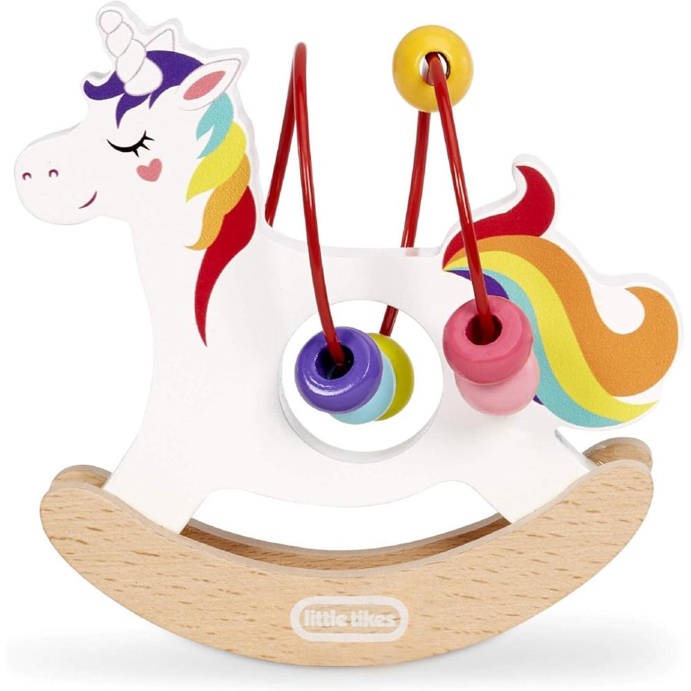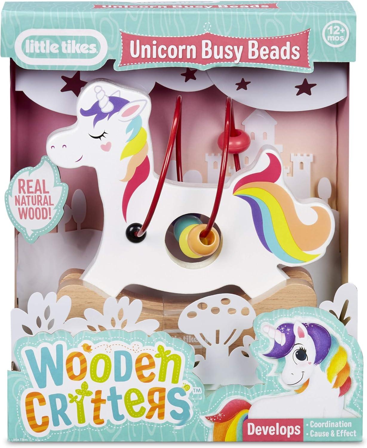 Little Tikes Wooden Critters toys are all-natural, sustainably-sourced, wooden infant-toddler toys infused with bright, colorful, fantastical designs. Each tree used in the creation of Wooden Critters toys is replaced with a seedling, helping create a brighter, greener future for our children. The Wooden Critters Unicorn Busy Beads features six colorful beads that swoop and slide along a wire path, and also rocks back and forth as kids play. Maze toys like the Unicorn Busy Beads help develop hand-eye coordination, fine motor, and cause and effect skills.